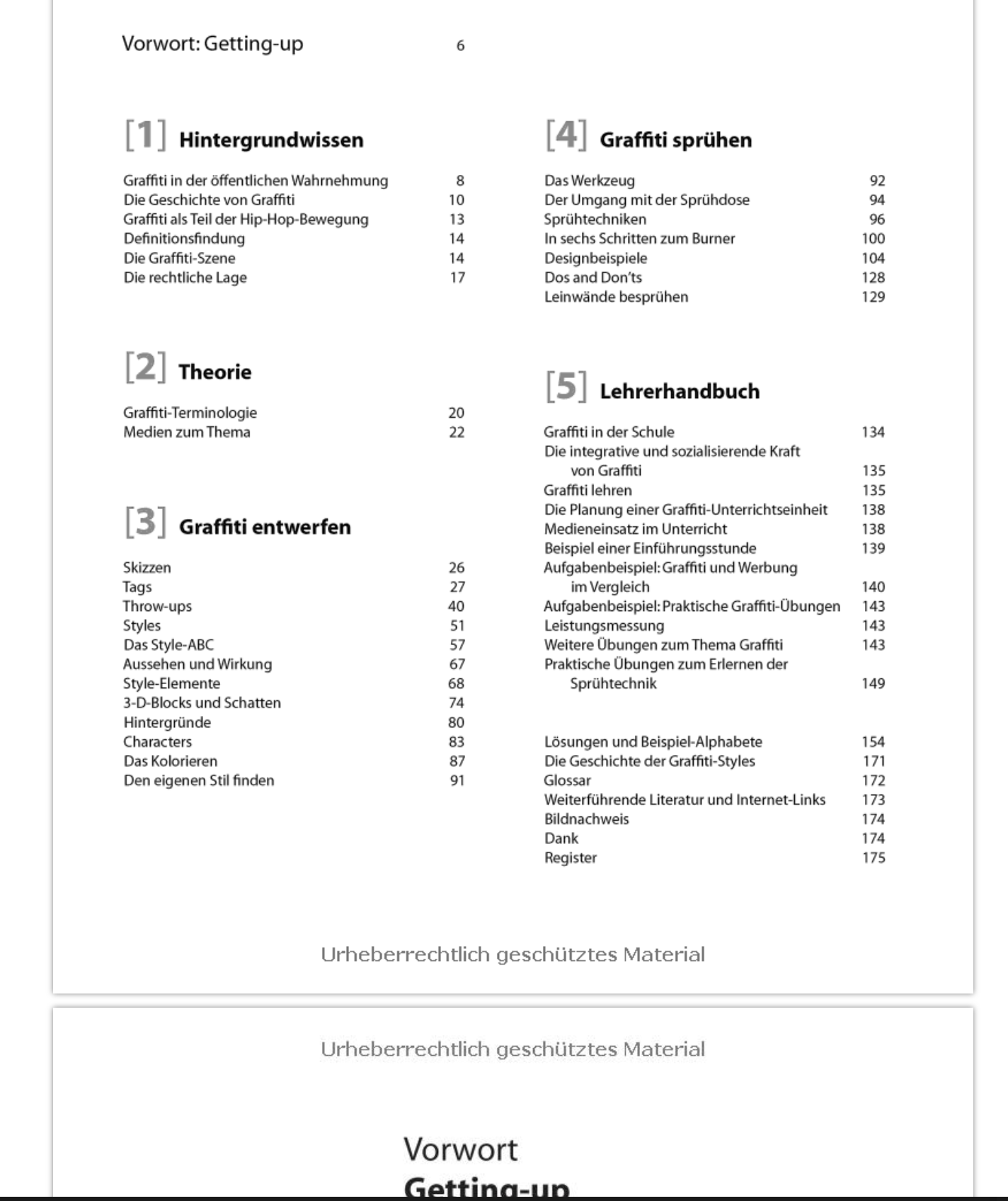 »Graffiti School« liefert in diesem Diskurs neben einem kurzen Überblick über die Anfänge der Graffitikunst vor allem jede Menge praktische Anleitungen und Basiswissen: von der Zusammensetzung, Handhabung und Pflege der Graffiti-Ausrüstung bis zur illustrierten Schritt-für-Schritt-Anleitung für Gestaltungselemente und Techniken. Zahlreiche Bildbeispiele von Graffiti aus aller Welt ergänzen dieses Manual. Der Autor Christoph „Jeroo“ Ganter kann dabei auf seine eigene Erfahrung als Graffitikünstler zurückgreifen.