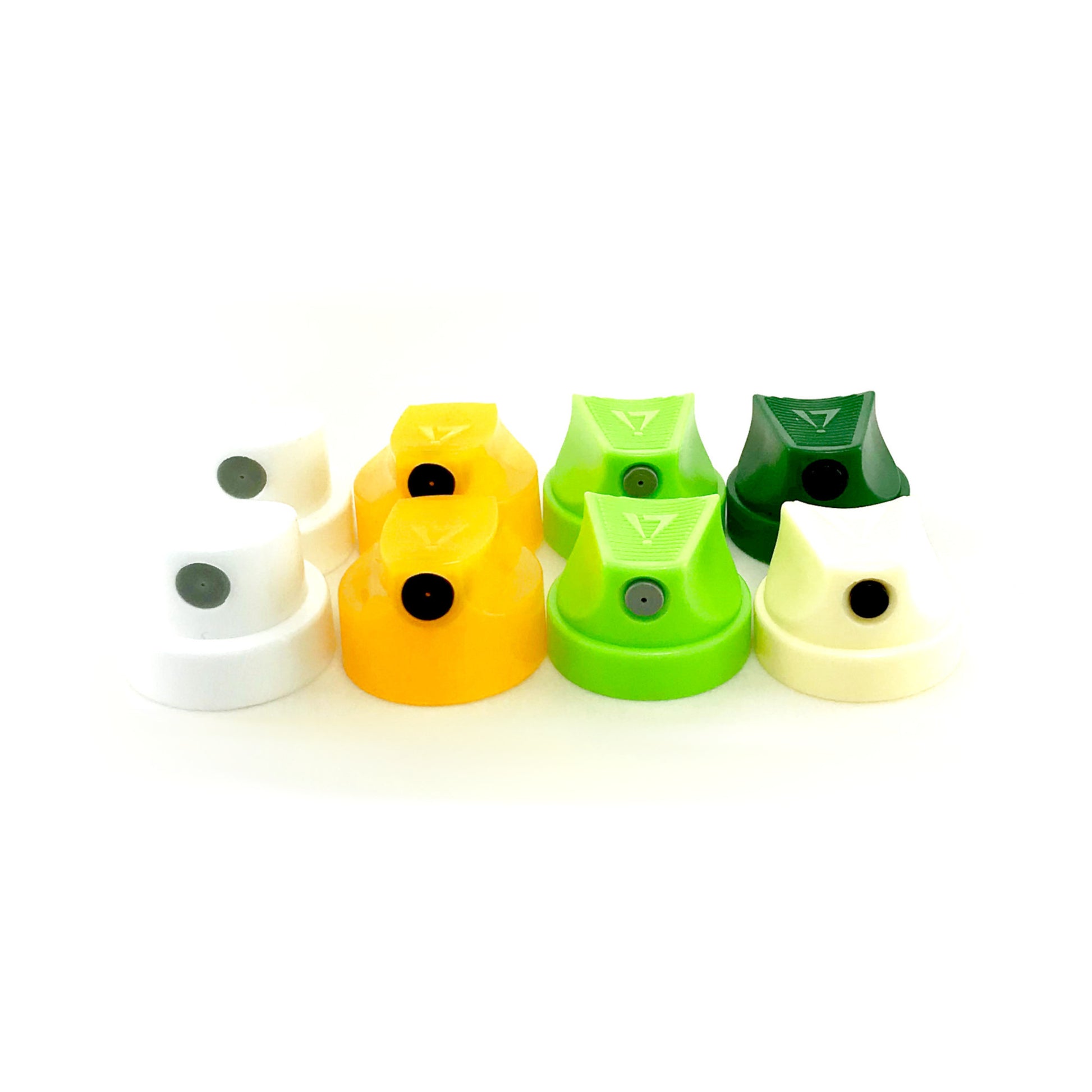 Verschiedene Dünne Sprühköpfe, zwei Super Skinnies, zwei Yellow Banana Universal Skinnies, zwei Level 1, sowie 2 verschiedene andere dünne Caps zum ausprobieren.