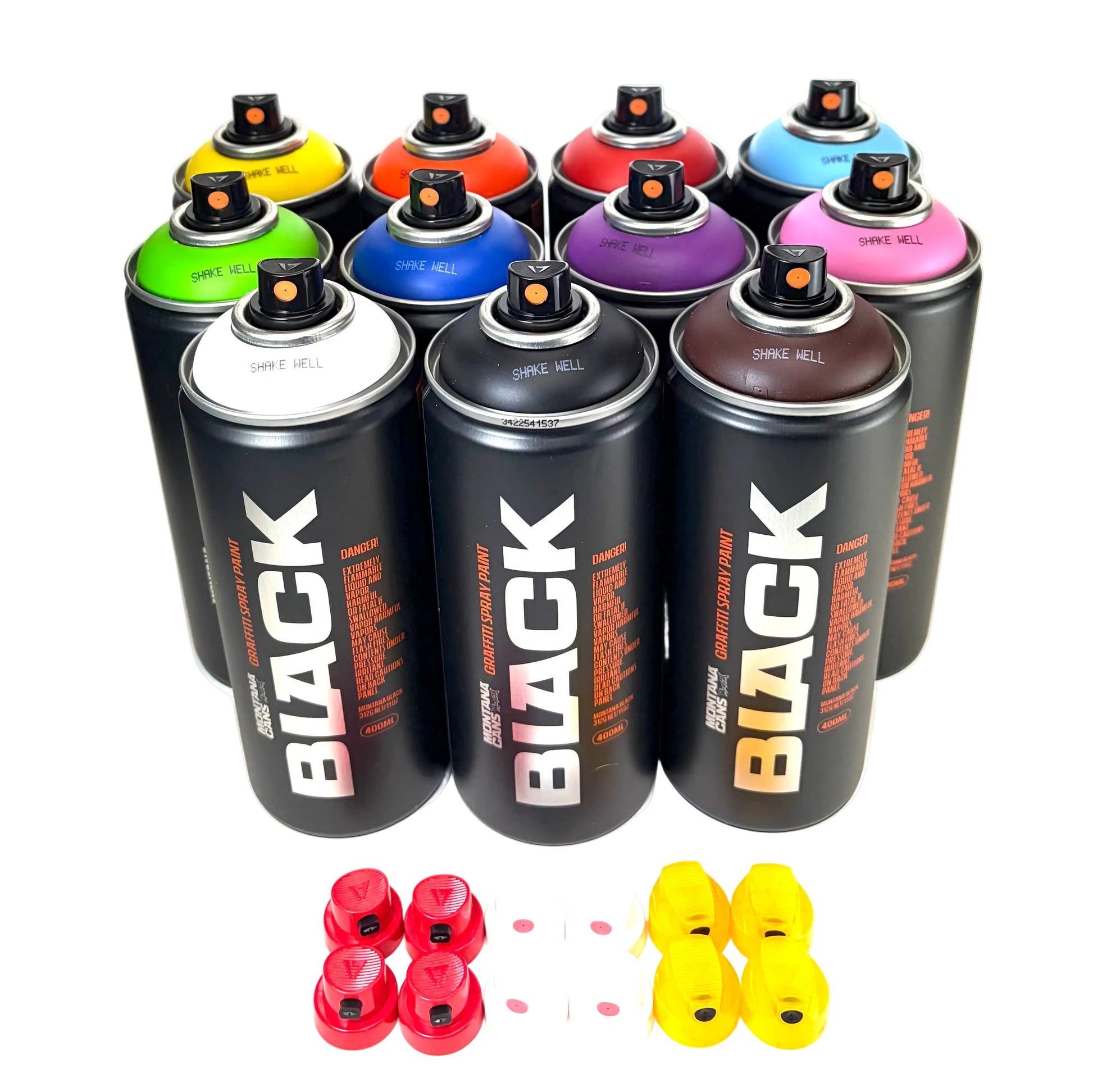 Regenbogen Sprühdosenset inspiriert von LGBT+ Pride Flag, auch Regenbogenfahne genannt, klassische Farbkombi von 1978 aus San Francisco. Mit zusätlichen Farben für die Progressflagge (Die mit dem Keil und oft kleinen Kreisdarin )